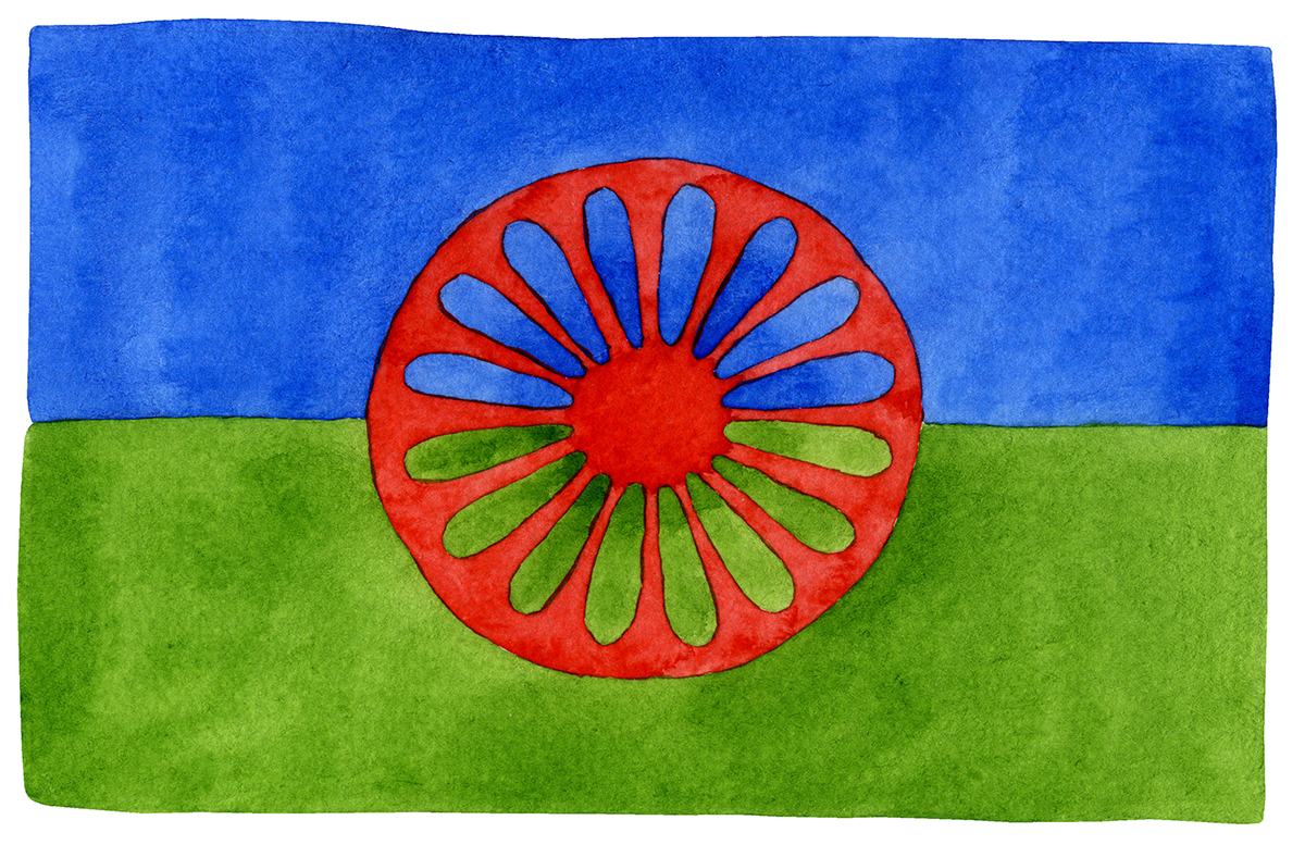 Lontoon romanikongressissa hyväksyttiin myös romanien oma lippu. Lipun keskellä oleva 16-puolainen punainen kärrynpyörä (chakra) symboloi romanikansan vaellusta. Lipun yläosan sininen symboloi taivasta, vapautta, hengellisyyttä ja ikuisuutta. Alaosan vihreä kuvaa luontoa ja maata. Kuva: Adobe Stock