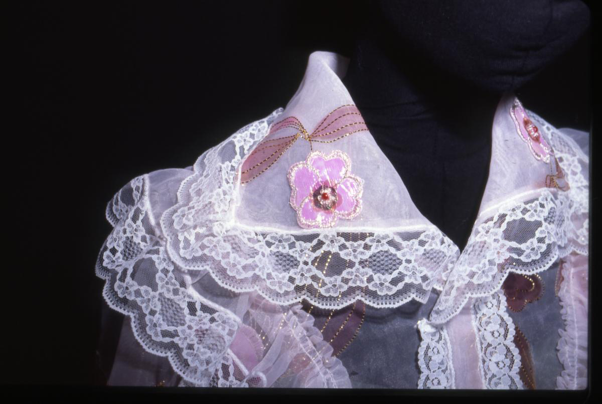Romaninaisen paidan eli röijyn pitsikaulus. Asu on ollut esillä romanikulttuurissa kertovassa Kokettiröijy-näyttelyssä vuonna 1988. Kuva: Nurmeksen kaupunginmuseo